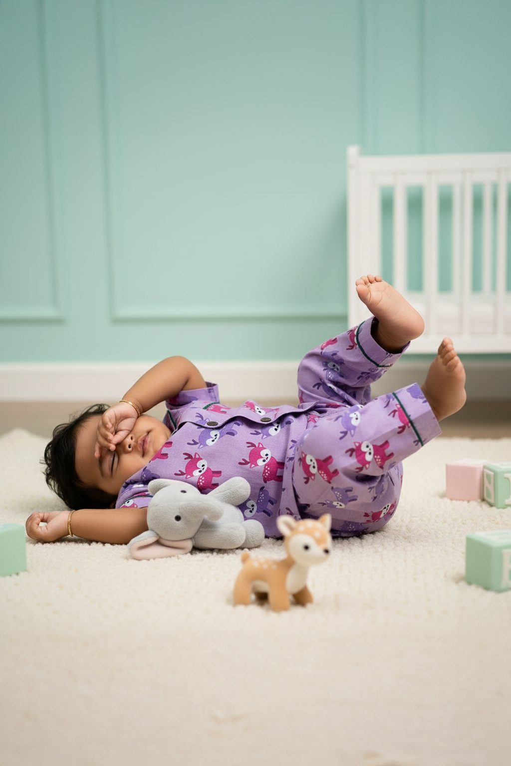 The soothing lavender base with whimsical multi-colour deer print adds charm and warmth, while the thoughtful design — a collared shirt with short sleeves paired with full-length elastic-waist pants — ensures unrestricted movement and all-day comfort. It’s not just clothing, it’s your child’s safe little cocoon.