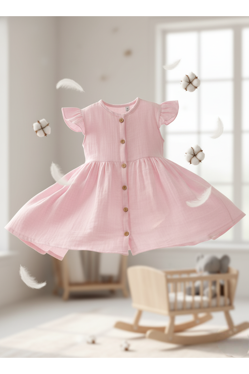 (Solid blush muslin, round-neck, front buttons, flutter sleeve, blush pink)