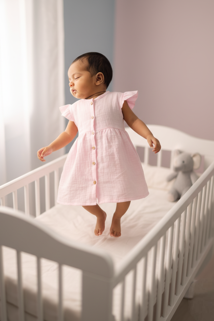 Soft blush in organic muslin with delicate flutter sleeves — Blush Twirl is classic, comfy and effortlessly cute.