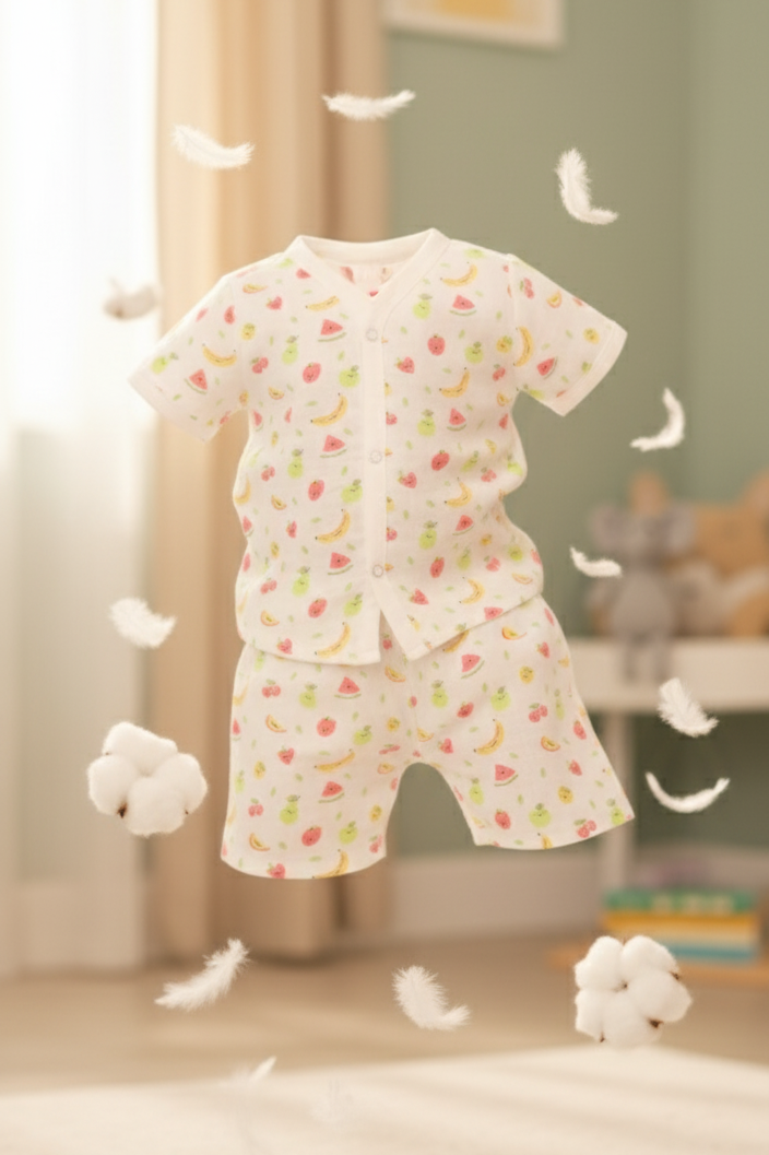 A playful burst of fruity prints makes this muslin co-ord a sunny-day essential — soft, breathable, and full of baby joy.