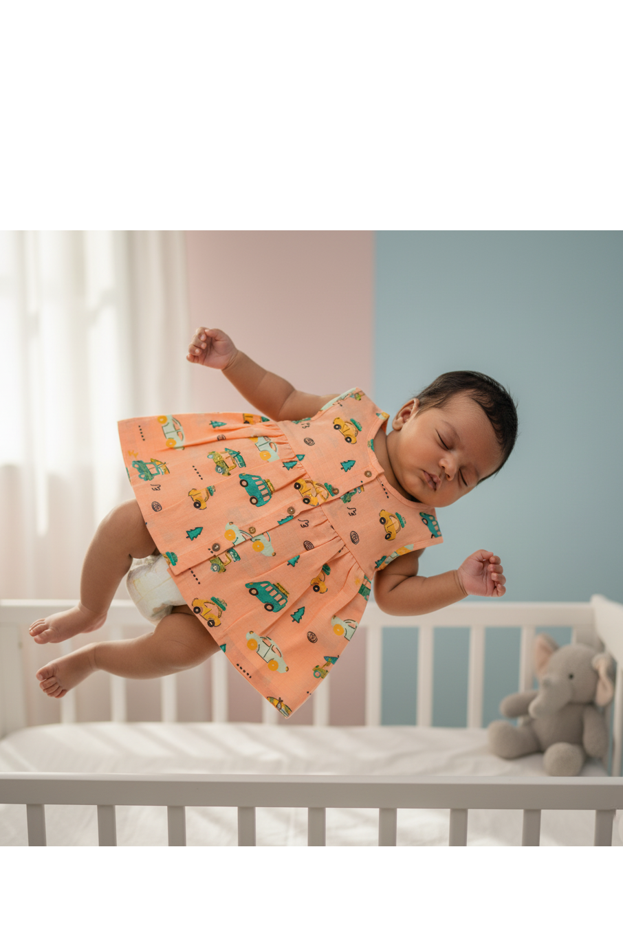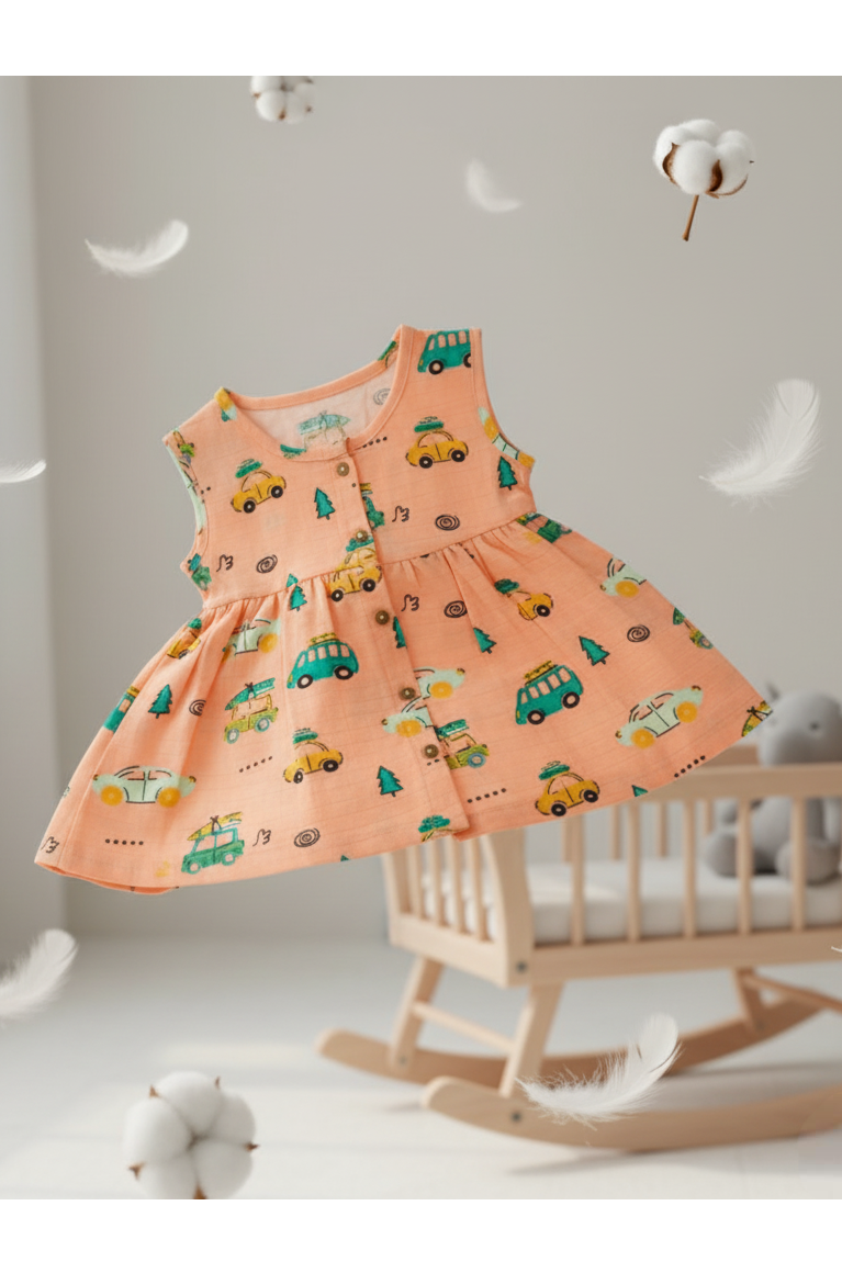 Let your tiny explorer enjoy breezy comfort with soft muslin cotton, playful vehicle prints, and a gentle sleeveless design. Perfect for warm days and adorable outings.