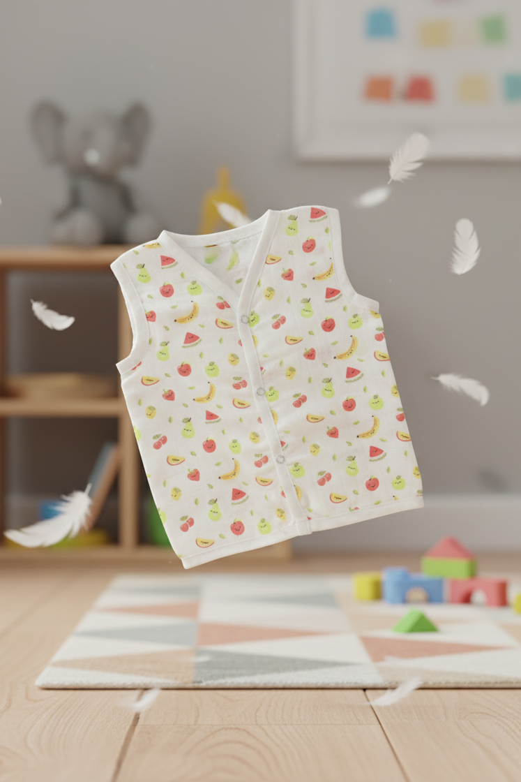 Sweet little fruits dance across this Fruity Giggles jabla — playful, bright, and perfectly soft for newborn skin. Made from feather-light organic cotton, the Round-Neck Front-Open design makes dressing gentle and fuss-free for new parents.