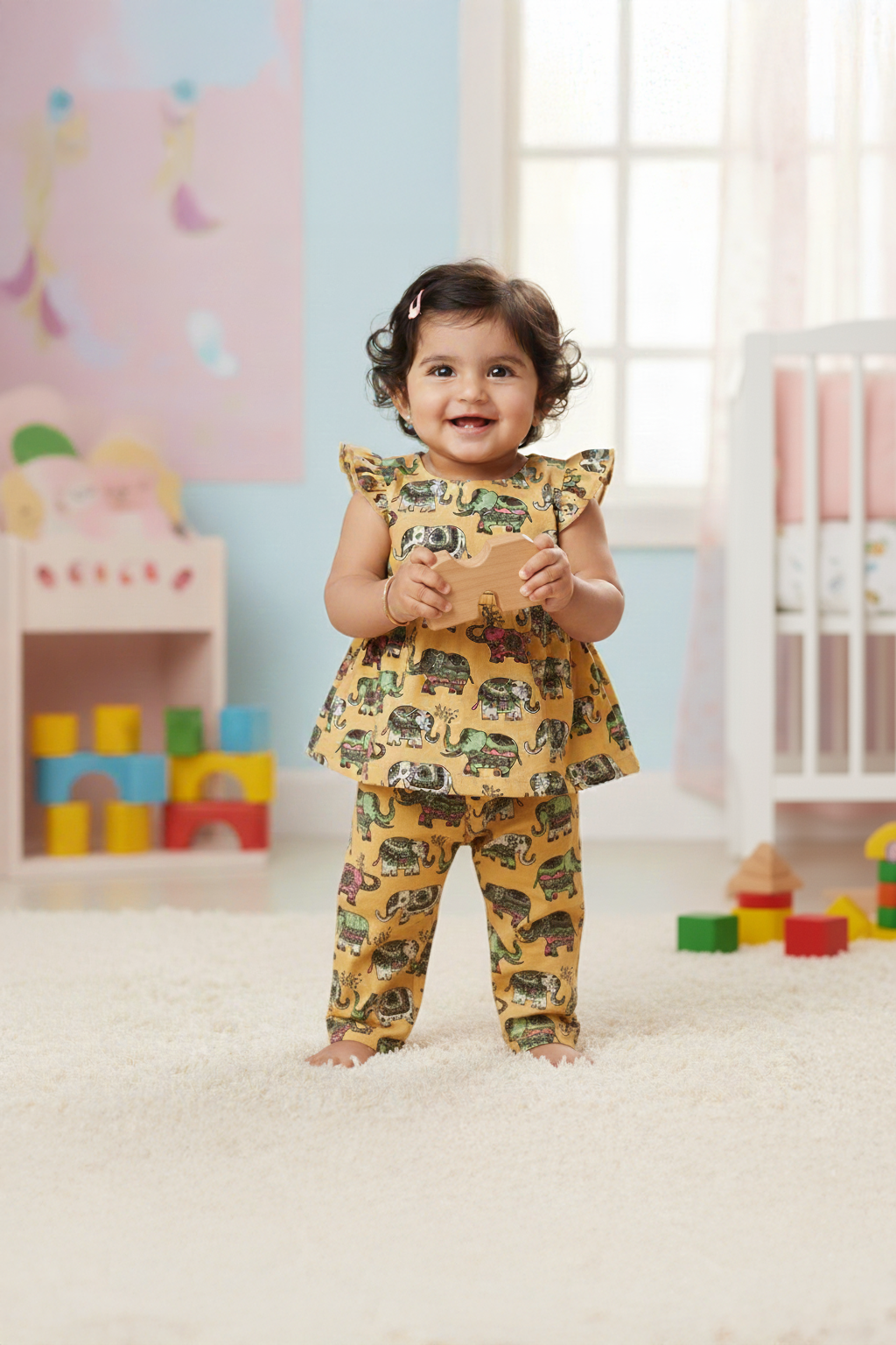 The mustard yellow base with vibrant multi-colour elephant prints 🐘 adds a playful yet stylish touch, while the design ensures ease of wear and all-day comfort. The co-ords feature a flutter-sleeve top with a flared hem paired with elastic-waist full-length pants, making it perfect for every little adventure—from playdates to family outings.