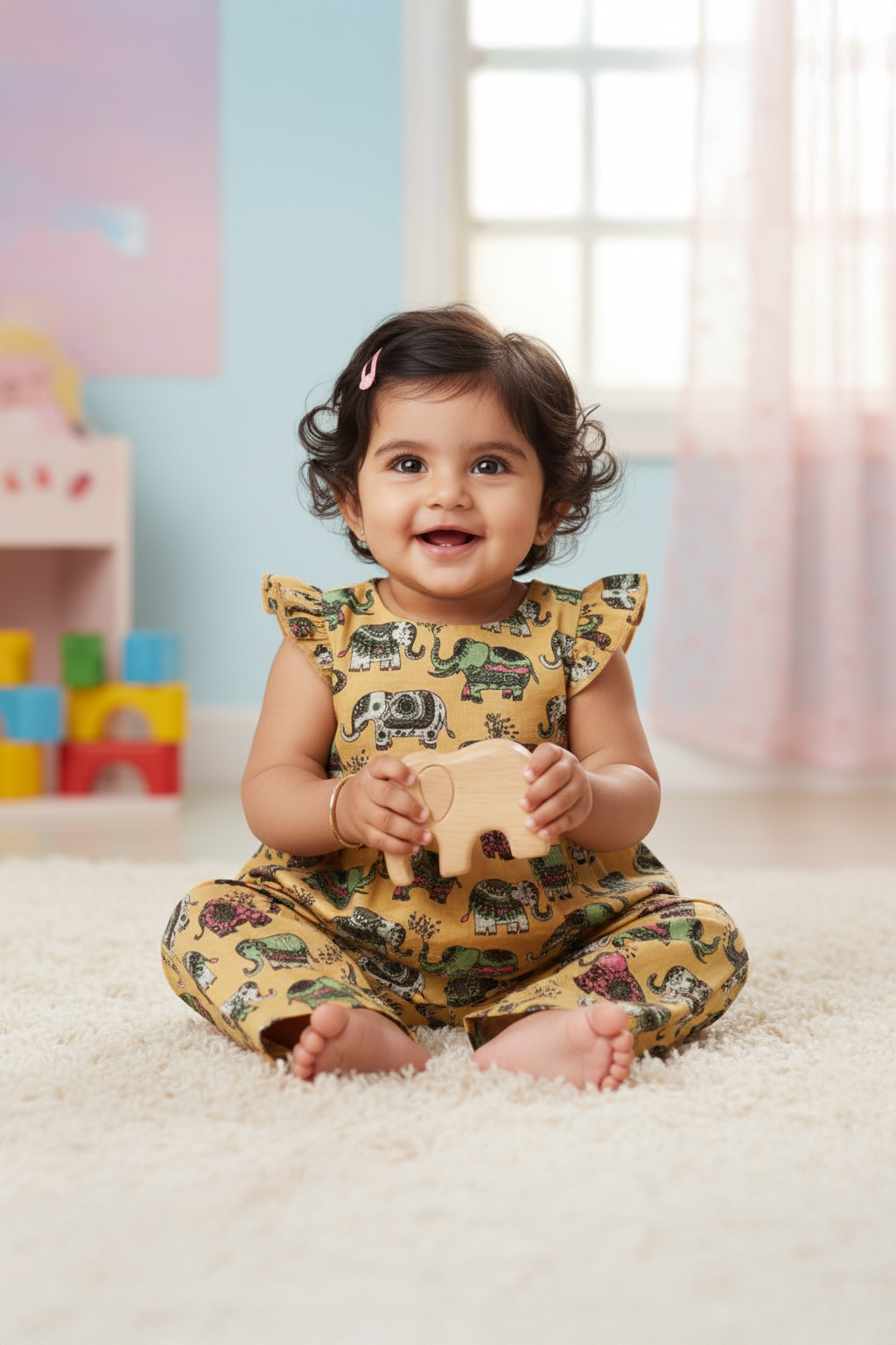 Watch your little one light up the room in this MIAAME BULOOA Mustard Elephant Co-ords Set. Designed for play, style, and comfort, it’s the perfect choice for both everyday wear and special occasions.