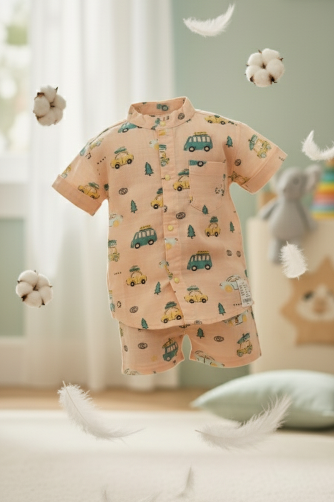 A peach-toned co-ord featuring tiny cars, trees & travel icons — breathable muslin fabric crafted for all-day ease and cuteness.