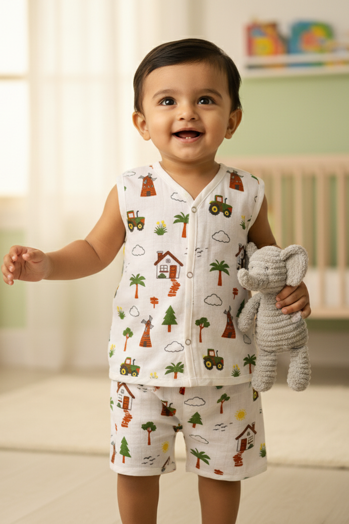 A countryside-inspired set designed with breathable muslin and adorable farm sketches — perfect for playful little farmers.