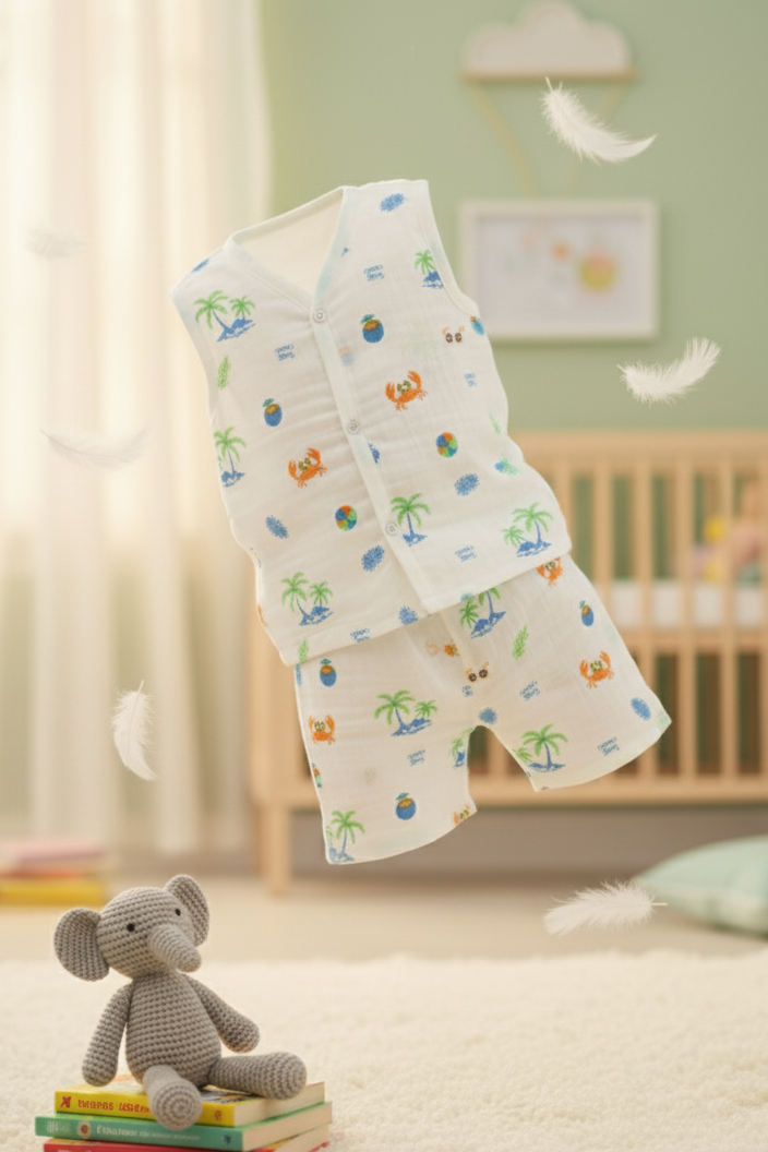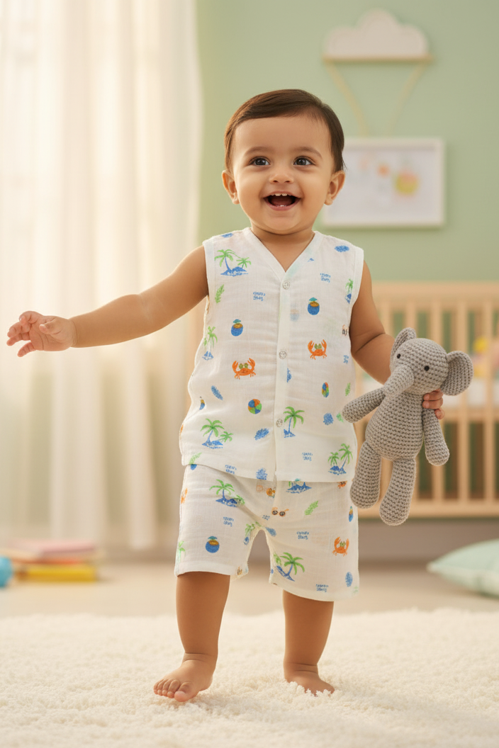 This Beach Day co-ord brings vacation vibes with adorable crabs, coconuts, palms and tiny island icons. Ultra-breathable muslin keeps your little one cool even on the warmest days.