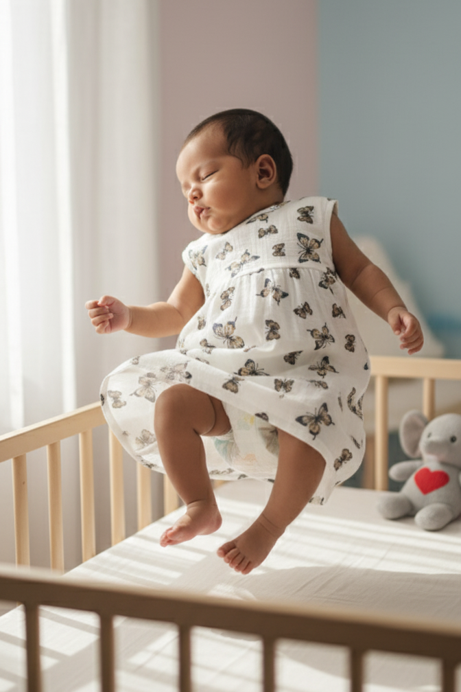 Crafted from soft muslin cotton with elegant butterfly prints, this frock twirls gently and keeps your little one cool all day.