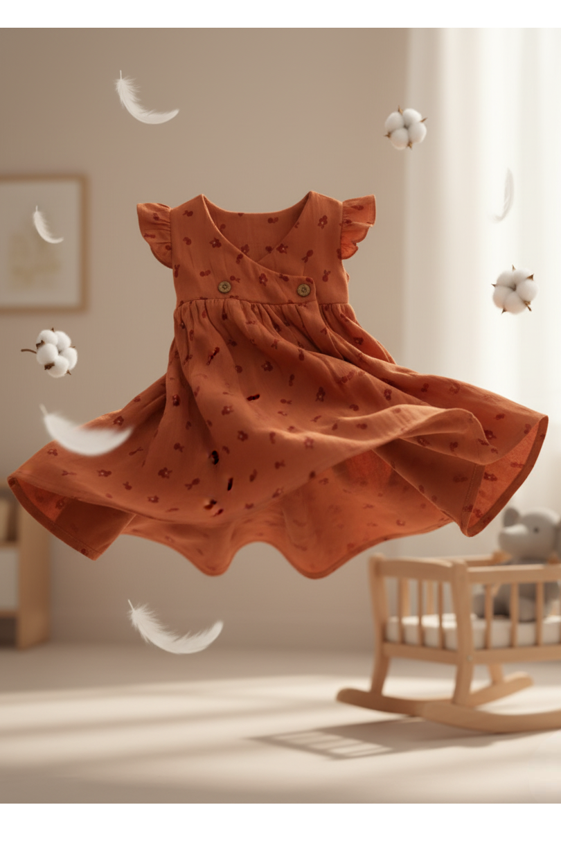 The Rustic Sunset Blossom frock brings earthy charm and gentle comfort together โ€” featuring puff-flutter sleeves and tiny floral patterns on soothing rust cotton.