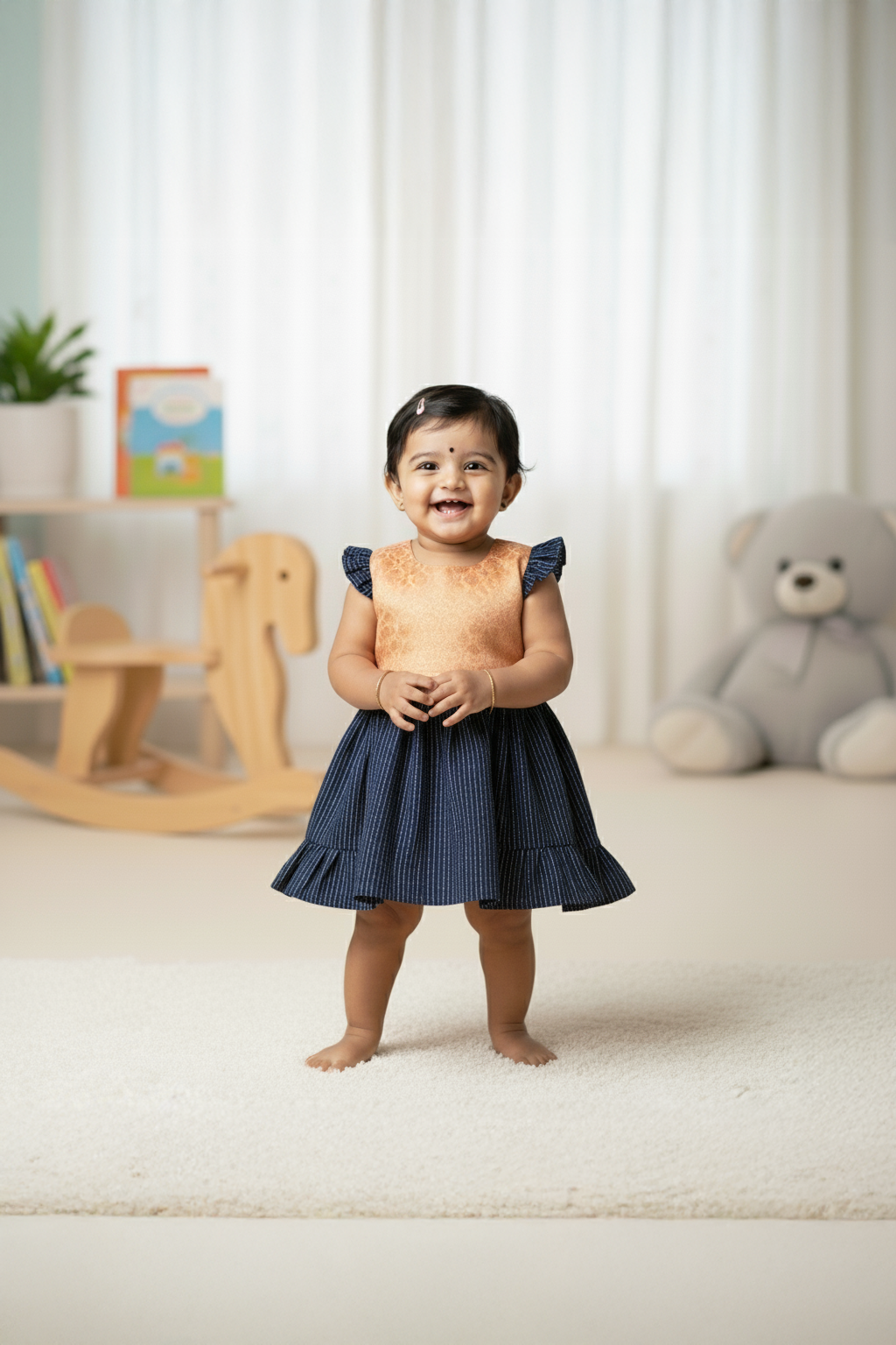 Some dresses are made for celebrations, and the Miaame Sunset Weave Cotton Frock is one of them. Crafted with a unique blend of traditional fabrics and modern comfort, this frock is designed to make your little one shine — at birthdays, family functions, or festive gatherings — while staying soft, breathable, and baby-friendly.