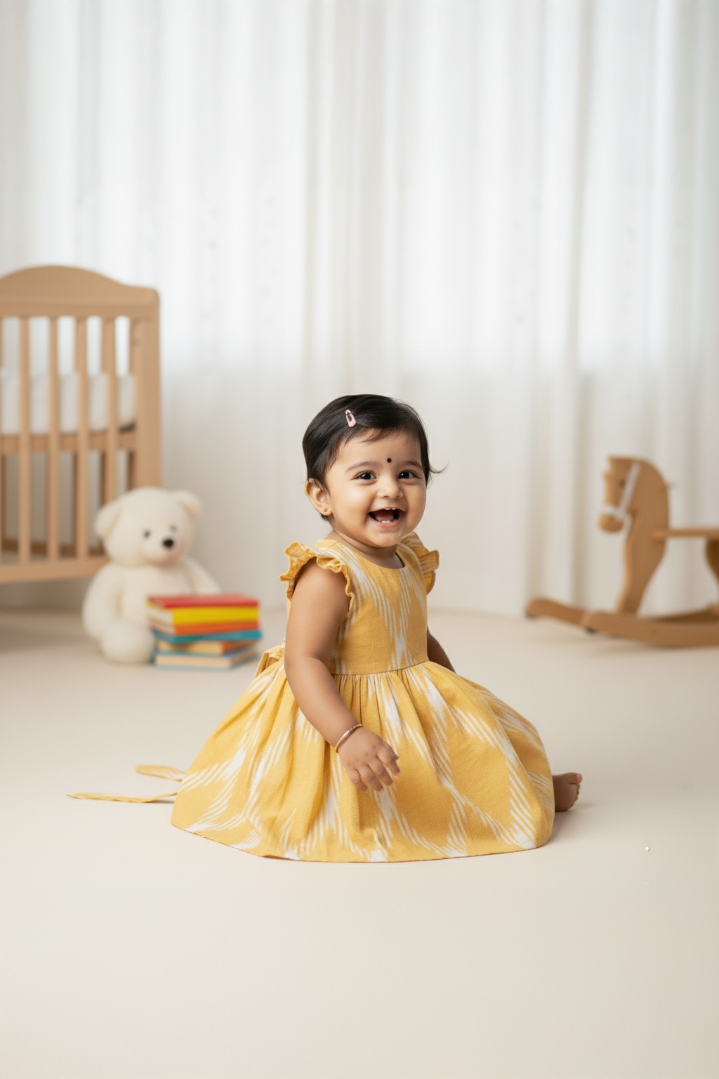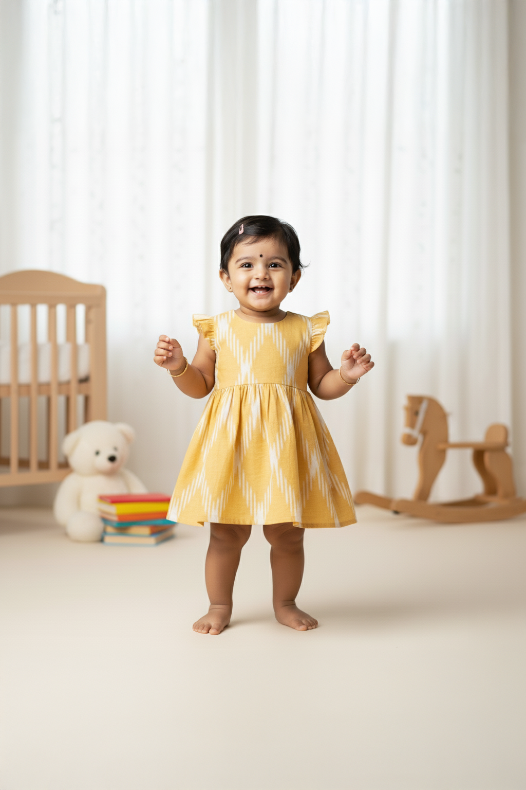 With its bright color and heritage-inspired print, the Sunshine Ikat Frock shines at family gatherings, festive occasions, or playful outings. It’s also a thoughtful gift for baby girls, blending cultural charm with modern practicality.